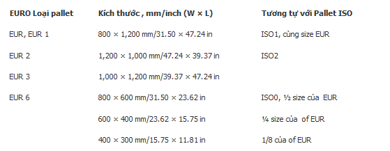 Bốn kích thước phổ biến của pallet EURO (cùng với kích thước thay thế ISO) là: